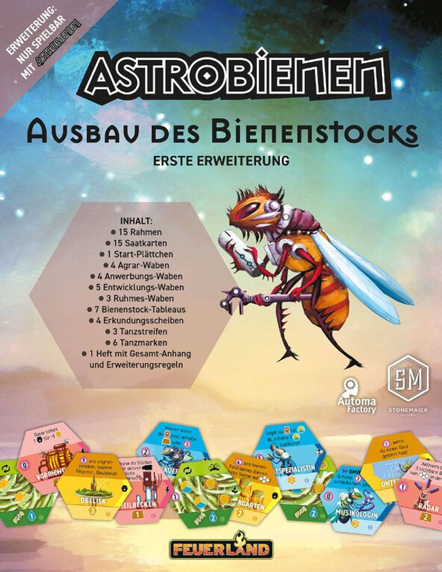 Mit Ausbau des Bienenstocks wächst dein Astrobienen-Erlebnis in alle Richtungen: Neue Wabenplättchen, zusätzliche Fraktionen und ein variabler Spielplan sorgen für frischen Wind im All. Du kannst deinen Bienenstock nun noch individueller gestalten und neue Strategien entwickeln. Die Erweiterung richtet sich an erfahrene Astrobienen-Spieler:innen, die noch mehr aus ihrem Bienenvolk herausholen wollen – solo oder in der Gruppe