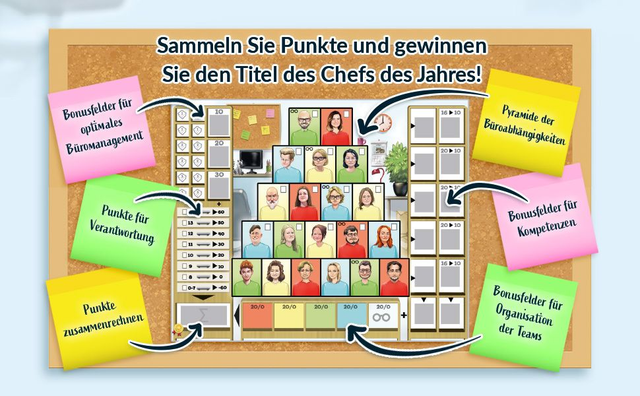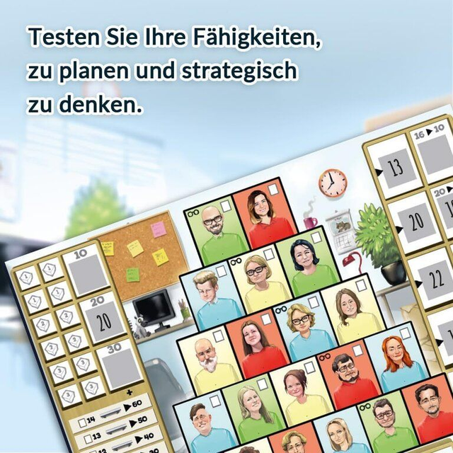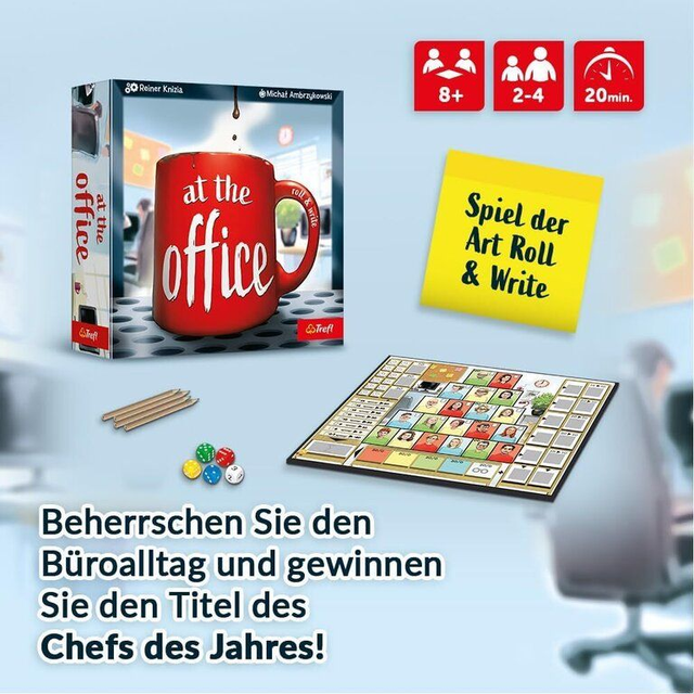 In At the Office übernimmst du die Rolle eines Büro-Managers, der sein Team durch den Arbeitsalltag führt. Mit fünf Würfeln bestimmst du, welche Aufgaben welchem Mitarbeitenden zugewiesen werden – abhängig von ihrer Position in der Büropyramide und den verfügbaren Boni. Doch Vorsicht: Die besten Ergebnisse sind schnell vergeben und du musst taktisch entscheiden. Sichere Punkte oder das große Ganze! Wirst du zum „Chef des Jahres“ gekürt!?