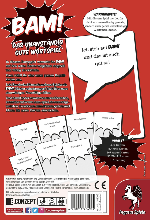 BAM! ist ein herrlich freches Party‑ und Wortspiel, bei dem ihr mit absurden Kombinationen für die lautesten Lacher sorgt. Eine Aufgabenkarte gibt das Thema vor – von „schlimmste Ausrede“ bis „peinlichster Moment“ – und alle spielen verdeckt eine passende Antwortkarte aus. Die Mischung aus clever, schräg und komplett daneben macht den Reiz aus. Der aktive Spieler wählt die lustigste Kombination und vergibt den Punkt. Dank hunderter Karten entstehen immer neue, völlig unerwartete Situationen, die jede Runde anders aussehen lassen. Schnell erklärt, sofort chaotisch und perfekt für Gruppen.