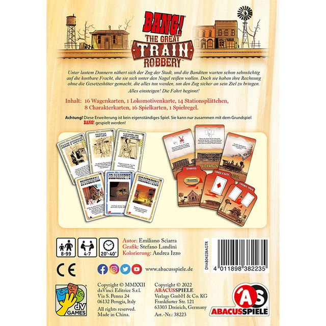 In The Great Train Robbery rast ein Zug durch die Prärie – und ihr seid mittendrin! Während der Sheriff versucht, Recht und Ordnung zu wahren, planen Outlaws den großen Coup. Der neue Zug-Spielplan bringt Bewegung ins Spiel: Ihr könnt Waggons betreten, Beute einsammeln und euch taktisch positionieren. Neue Karten wie „Zugüberfall“, „Sprengladung“ oder „Waggonwechsel“ sorgen überraschende Wendungen. Wer clever agiert, kann sich nicht nur Ruhm, sondern auch reiche Beute sichern.