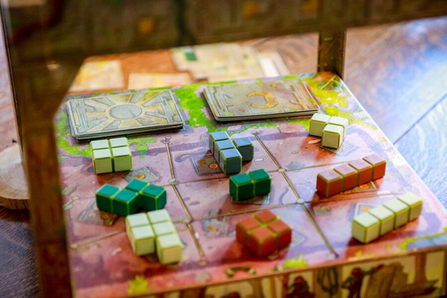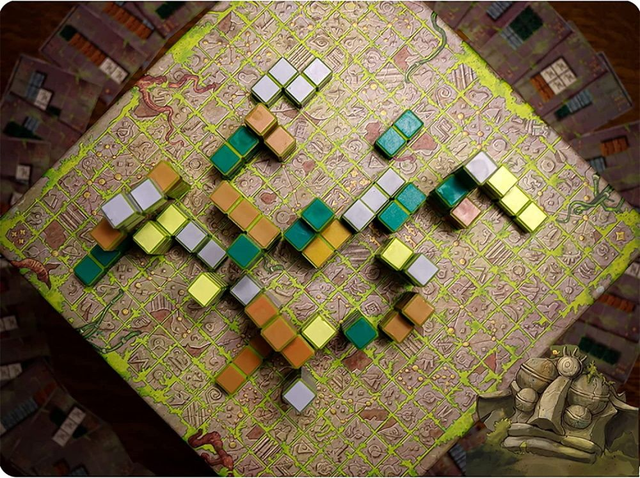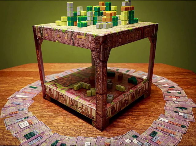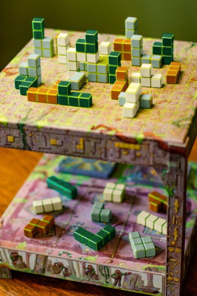 In einem alten Tempel wetteifert ihr darum, die uralten Rätsel zuerst zu lösen. Jeder von euch sieht den zentralen Spielbereich – eine erhöhte 3D-Plattform – nur aus der eigenen 2D-Perspektive. Ziel ist es, farbige Blöcke so zu platzieren, dass sie aus deiner Sicht bestimmte Muster ergeben, die deinen Auftragskarten entsprechen. Dabei zählt nicht, wer die Steine gesetzt hat – sondern wie sie von deinem Platz aus erscheinen.