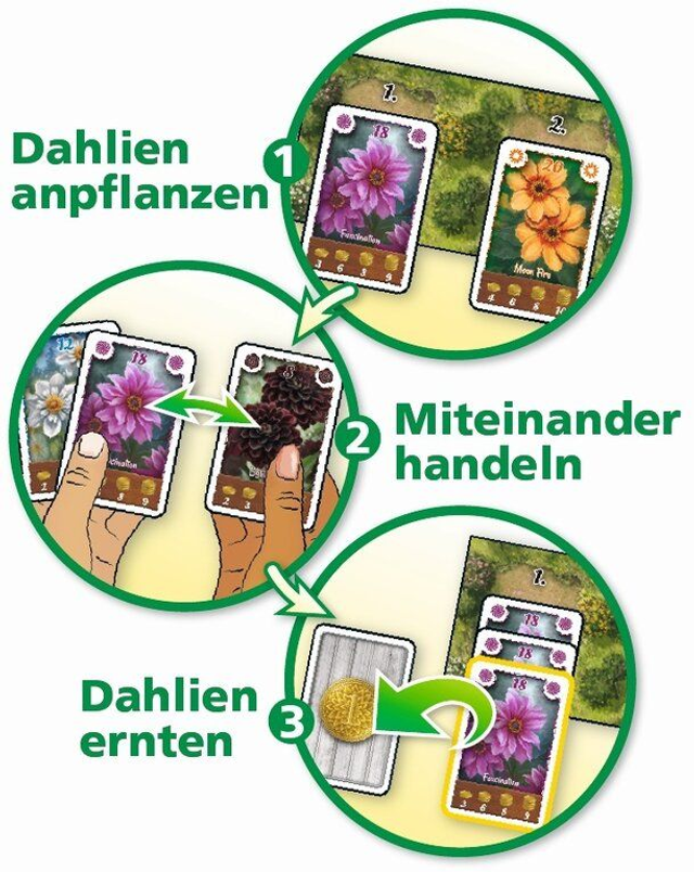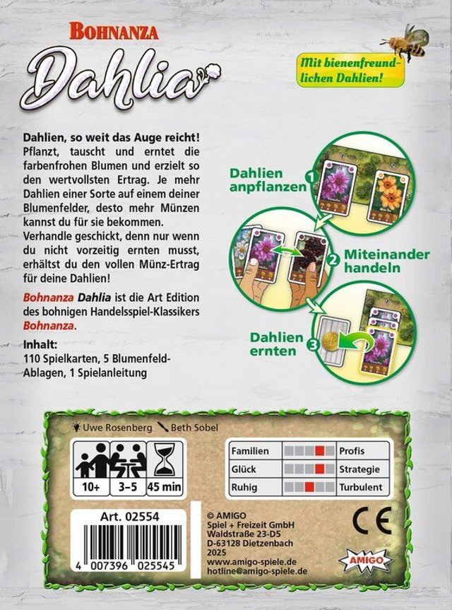 In Bohnanza: Dahlia betreibt ihr keinen Bohnenacker, sondern einen prächtigen Blumengarten. Ziel ist es, möglichst viele Dahlien einer Sorte auf einem Feld zu pflanzen und zum richtigen Zeitpunkt zu ernten. Doch aufgepasst: Die Kartenhand darf nicht sortiert werden! Du musst also geschickt handeln, verschenken oder anbauen, was du bekommst. Nur wer clever verhandelt und seine Felder optimal nutzt, wird zur erfolgreichsten Dahliengärtnerin oder -gärtner.