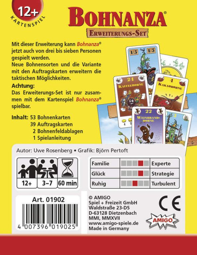 Das Bohnanza Erweiterungsset ergänzt das Grundspiel um drei neue Varianten, die einzeln oder kombiniert gespielt werden können. Mit zusätzlichen Bohnensorten wie Kakao-, Kaffee-, Weinbrand- und Ackerbohnen wird das Bohnenfeld noch vielfältiger. Die neuen Auftragskarten erweitern die taktischen Möglichkeiten: Erfülle bestimmte Bohnenkombinationen für Bonuspunkte! Außerdem erlaubt das Set das Spiel mit bis zu sieben Personen – ideal für größere Runden. Die Regeln bleiben dem Original treu: Handkarten dürfen nicht sortiert werden, und geschicktes Handeln bleibt der Schlüssel zum Erfolg.