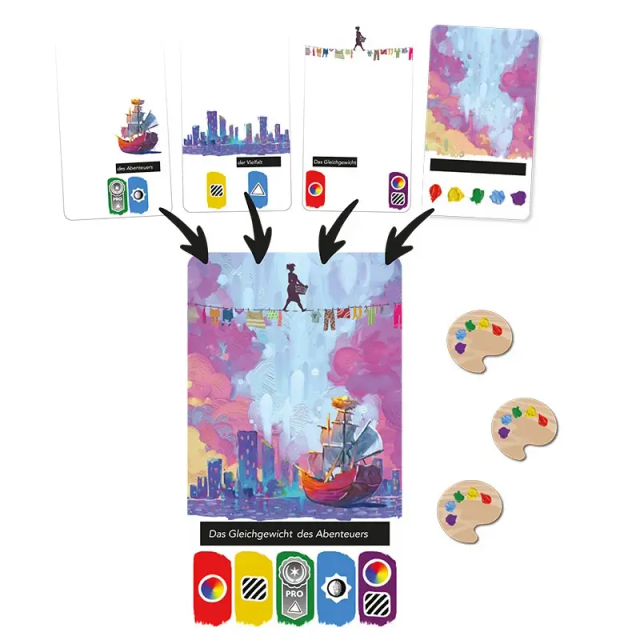Canvas ist ein wunderschön gestaltetes Familienspiel, in dem ihr als Künstler transparente Karten übereinanderlegt, um einzigartige Gemälde zu erschaffen und damit die Wertungskriterien eines Kunstfestivals zu erfüllen. Jede Kombination erzeugt ein völlig neues Bild – inklusive individuellem Titel. Sobald jede Person drei Gemälde erschaffen hat, endet das Spiel.