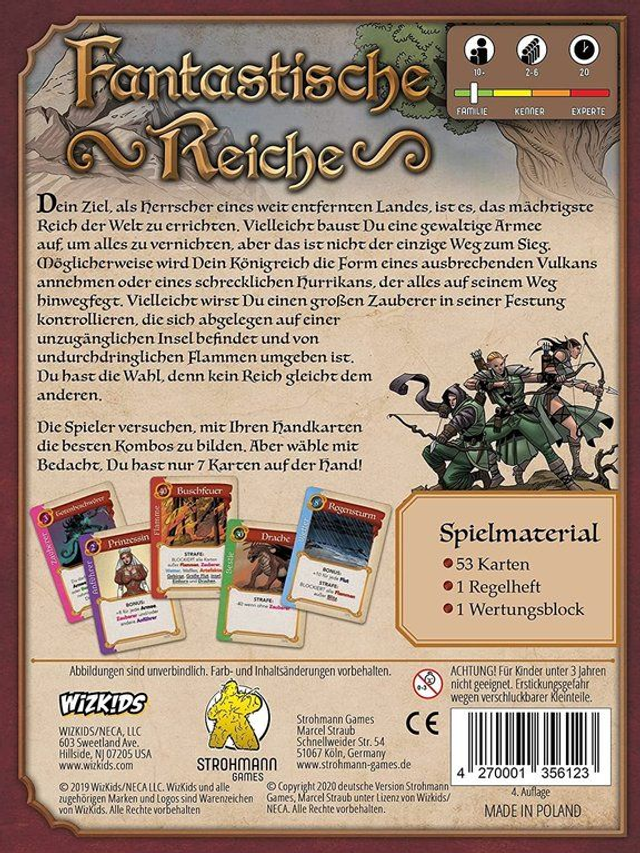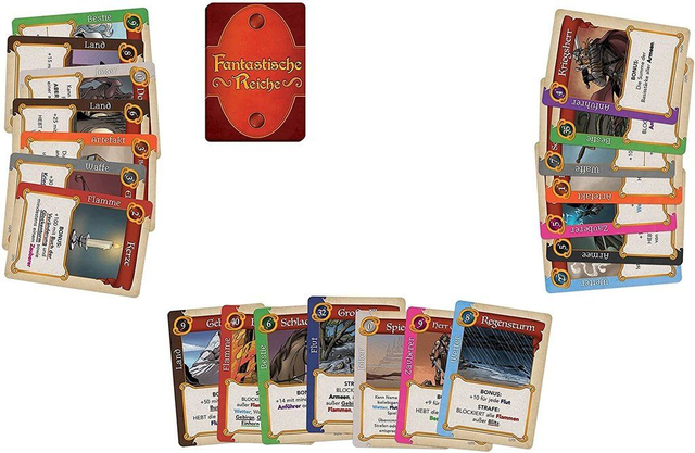 Fantastische Reiche ist ein taktisches Kartenspiel voller taktischer Möglichkeiten – erschaffe dein Reich, kombiniere Karten clever und sammle die meisten Punkte, um als Herrscher über das mächtigste aller Reiche hervorzugehen. In Fantastische Reiche versuchst, mit nur sieben Karten die stärkste Kombination zu bilden. Jede Karte gehört zu einer von zehn Kategorien – etwa Armee, Magie oder Wetter – und entfaltet ihre volle Kraft erst im Zusammenspiel mit passenden Karten