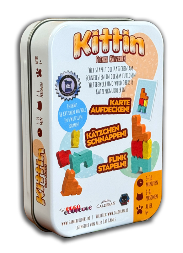 In Kittin geht es um Geschwindigkeit und Geschick. Jeder Spieler erhält kleine Katzen-Meeple, die wie Würfel gestapelt werden können. Eine Karte zeigt euch, wie der Turm aussehen soll! Wer den Turm zuerst errichtet, gewinnt die Karte. Doch Vorsicht: Die Katzen sind wackelig, und ein falscher Stapel kann alles zum Einsturz bringen. Ein turbulentes Partyspiel, das für jede Runde die richtige Portion Chaos und Gelächter liefert