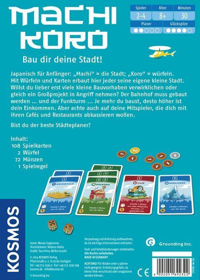 Machi Koro ist ein charmantes Städtebau-Kartenspiel aus Japan, bei dem ihr mit Würfeln, Karten und Investitionen eure eigene Stadt errichtet – schnell, interaktiv und voller Überraschungen. Mit jedem Würfelwurf erwirtschaftet ihr Einkommen aus euren Gebäuden und entwickelt eure Stadt weiter. Ziel ist es, als Erstes alle vier Wahrzeichen zu errichten – Bahnhof, Einkaufszentrum, Freizeitpark und Rathaus. Dabei sorgen die unterschiedlichen Gebäudekarten für spannende Synergien