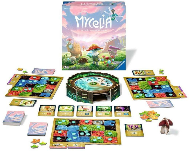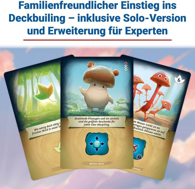 Mycelia ist ein zugängliches Deckbuilding‑Familienspiel, in dem ihr als Waldbewohner versucht, eure verstreuten Tautropfen zum Schrein des Lebens zu bringen. Jede Runde spielt ihr Karten aus eurem persönlichen Deck, verbessert eure Fähigkeiten und nutzt die Unterstützung mystischer Kreaturen, um euer Tableau effizient zu leeren.