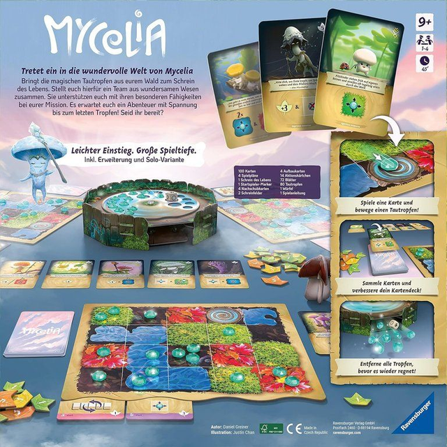 Mit doppelseitigen Spielplänen, über 100 Karten und variablen Kombinationen bietet jede Partie neue Wege, eure Strategie zu optimieren. Wer seine Karten clever verbessert und die Tautropfen am schnellsten zum Schrein führt, gewinnt den Segen der Waldgöttin.