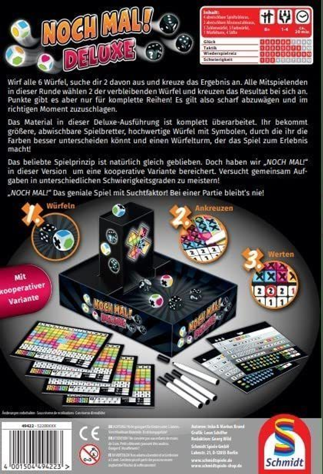 In Noch mal! – Deluxe bleibt das Grundprinzip erhalten: Mit Würfeln kreuzt ihr Felder auf eurem Spielblock an, vervollständigt Reihen und Spalten und sammelt Punkte. Doch die Deluxe-Version bringt frischen Wind ins Spiel: Neue, abwechslungsreiche Spielblöcke mit besonderen Herausforderungen, zusätzliche Würfel für noch mehr Kombinationsmöglichkeiten und eine hochwertige Ausstattung machen das Spiel noch spannender.