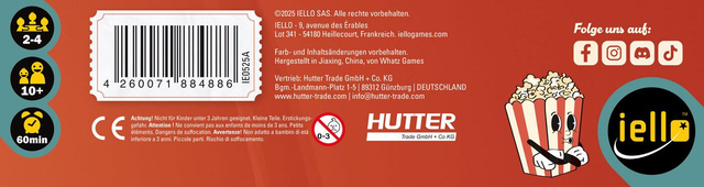 Popcorn ist ein zugängliches Bag‑Building‑ und Kinomanagement‑Spiel, in dem ihr euer eigenes Kino betreibt. In jeder Runde stellt ihr euer Programm zusammen, kauft neue Filme, baut eure Säle aus und lockt frisches Publikum an. Anschließend zieht ihr Zuschauer aus eurem Beutel und platziert sie gezielt in den Reihen eurer Kinosäle, um starke Effekte und Film‑Boni auszulösen. Ältere Filme verlieren nach und nach an Wirkung, also müsst ihr euer Programm regelmäßig erneuern und die Konkurrenz im Blick behalten. Wer am Ende das meiste Popcorn sammelt, gewinnt.