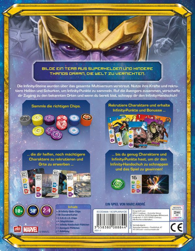 In Splendor Marvel schlüpft ihr in die Rolle mächtiger Fraktionen des Marvel-Universums. Ihr jagt die sechs Infinity-Steine und rekrutiert ikonische Helden und Schurken. Mit jeder Runde baut ihr euer Team aus, verstärkt eure Macht und nähert euch dem ultimativen Ziel: die Kontrolle über das Universum. Wer zuerst alle Infinity-Steine vereint und die Avengers oder Thanos’ Gefolge für sich gewinnt, erringt den Sieg.