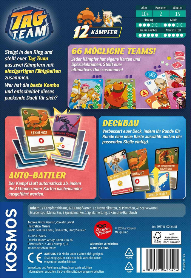 Tag Team ist ein rasantes Duellspiel für zwei Personen, in dem ihr euch mit euren Kämpfern im Ring gegenübersteht. Jede Seite stellt sich ein Tag Team aus zwei einzigartigen Charakteren zusammen, mischt deren Karten zu einem Deck und lässt dann die Fäuste fliegen: Angriffe, Blocks, Heilungen und Spezialeffekte sorgen für einen stetigen Schlagabtausch.