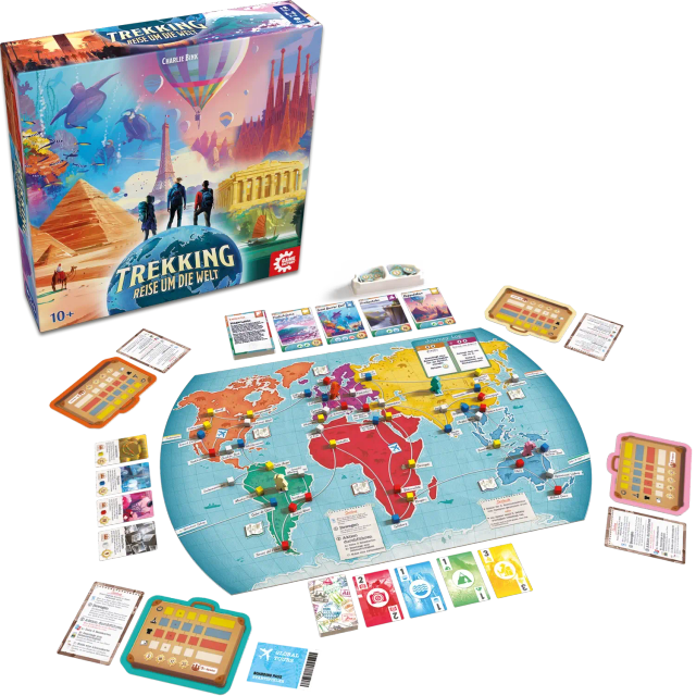 Trekking – Reise um die Welt ist ein familienfreundliches Abenteuerspiel, in dem ihr die berühmtesten Orte unseres Planeten bereist. Mit jeder Bewegung über die Weltkarte sammelt ihr Reisesouvenirs, erfüllt Aufträge und besucht Naturwunder, historische Stätten und ikonische Landschaften. Doch die Konkurrenz schläft nicht: Wer zu lange zögert, verpasst wertvolle Ziele. Planung, Timing und ein wenig Glück entscheiden darüber, wer die beeindruckendste Weltreise erlebt. Mit einfachen Regeln, großformatigem Spielplan und tollen Illustrationen lädt Trekking – Reise um die Welt zu einer spielerischen Entdeckungstour rund um den Globus ein.