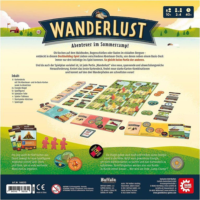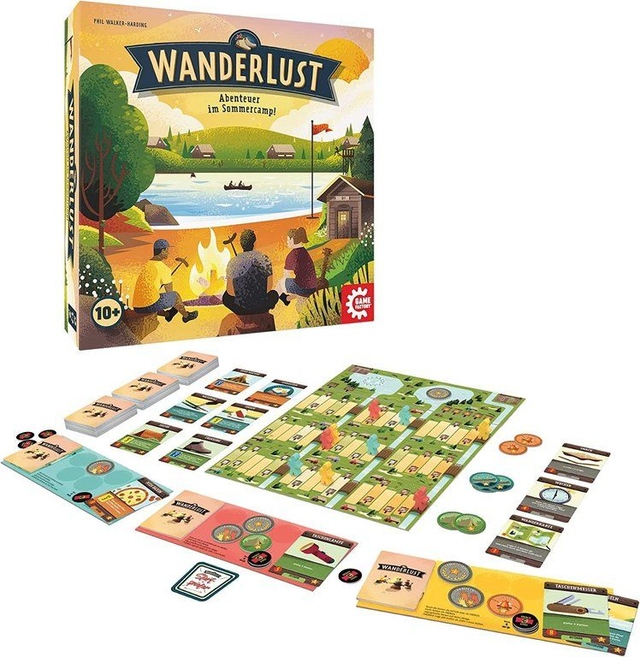 Wanderlust – Abenteuer im Sommercamp ist ein familienfreundliches Deckbuilding-Spiel, in dem ihr mit Karten eure Spielfiguren durch verschiedene Disziplinen eines Camps bewegt (etwa Wassersport, Kochen, Handwerk, Freundschaft, Natur oder Gruppenspiele) und Abzeichen sammelt. Jeder Spieler startet mit einem kleinen Kartendeck, das im Laufe der Partie durch neue Karten erweitert wird.